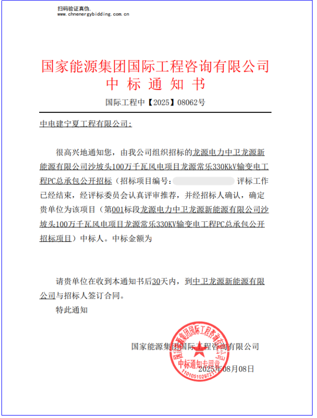8月7日,公司中标国家能源集团龙源电力中卫龙源新能源有限公司沙坡头100万千瓦风电项目龙源常乐330千伏输变电工程PC总承包项目。