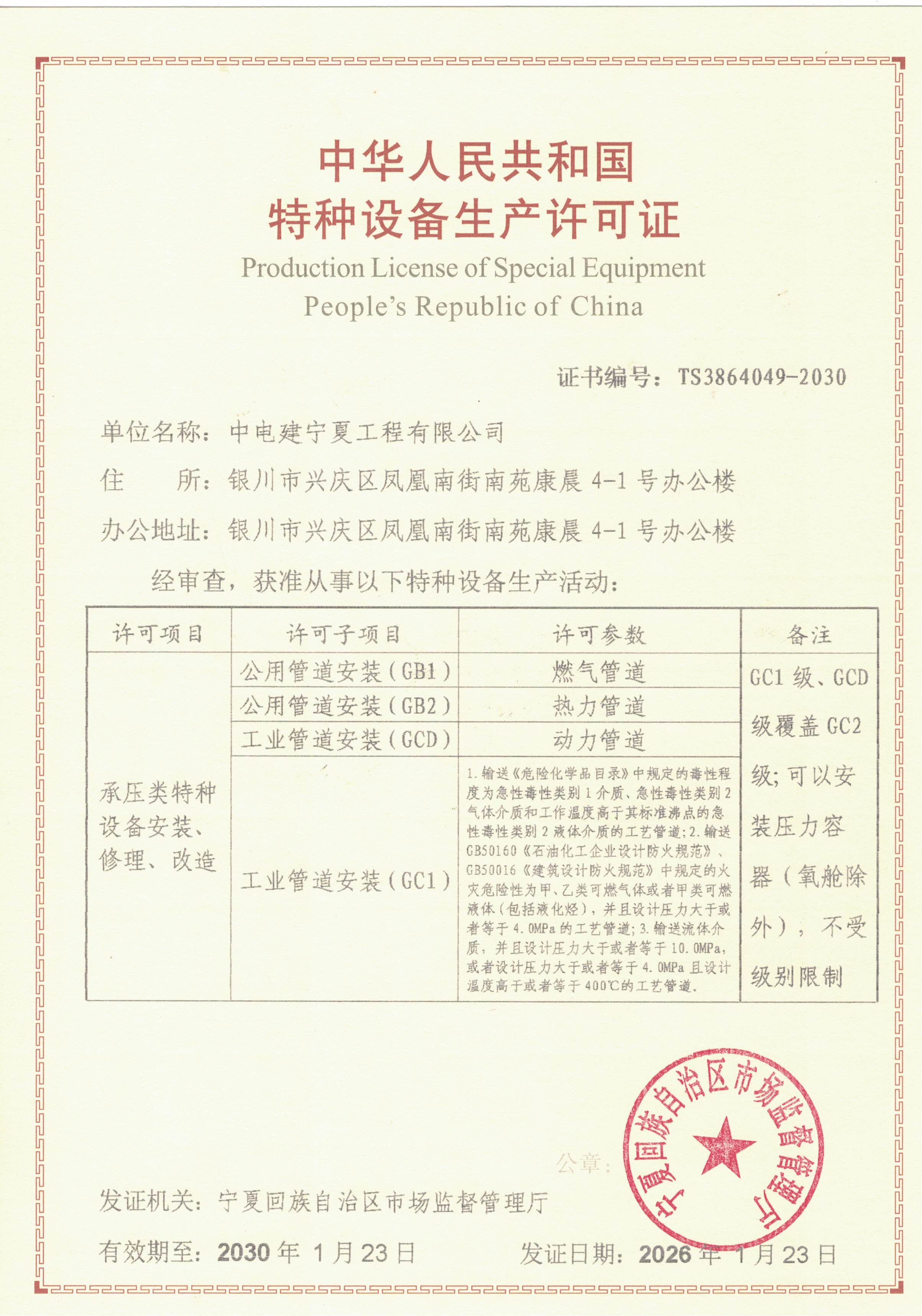 近日,从宁夏回族自治区市场监管厅传来喜讯,公司顺利取得更新后的《特种设备生产许可证》(压力管道安装)。新证书不仅完成了压力管道GB1(燃气管道)、GB2(热力管道)、GCD(动力管道)级别的延续换证,有效期延长至2030年1月23日,更成功实现了压力管道GC1级(工业管道最高级别)安装资质的增项。