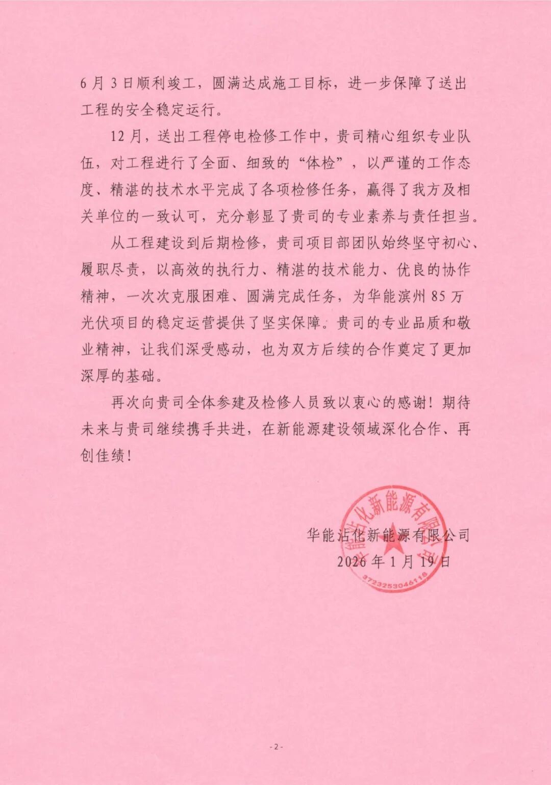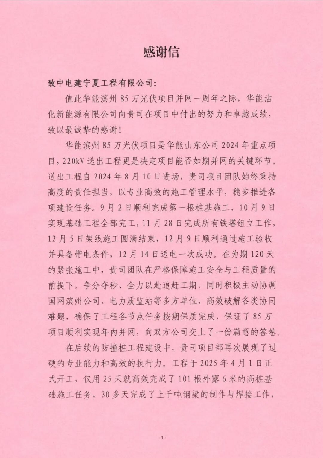 近日,华能沾化新能源有限公司向公司发来感谢信,对公司在华能滨州85万光伏项目220kV送出工程及防撞桩工程建设与停电检修工作中付出的辛勤努力和卓越贡献,致以最诚挚的感谢。