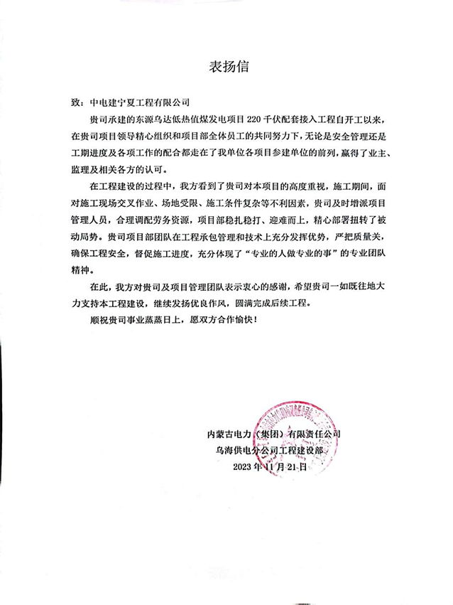 信中,业主单位对项目团队在建设过程中,精心策划、科学组织表示高度认可,充分体现了宁夏电建的综合实力,对项目团队迎难而上、团结一致、全力以赴的工作态度表示高度赞许。