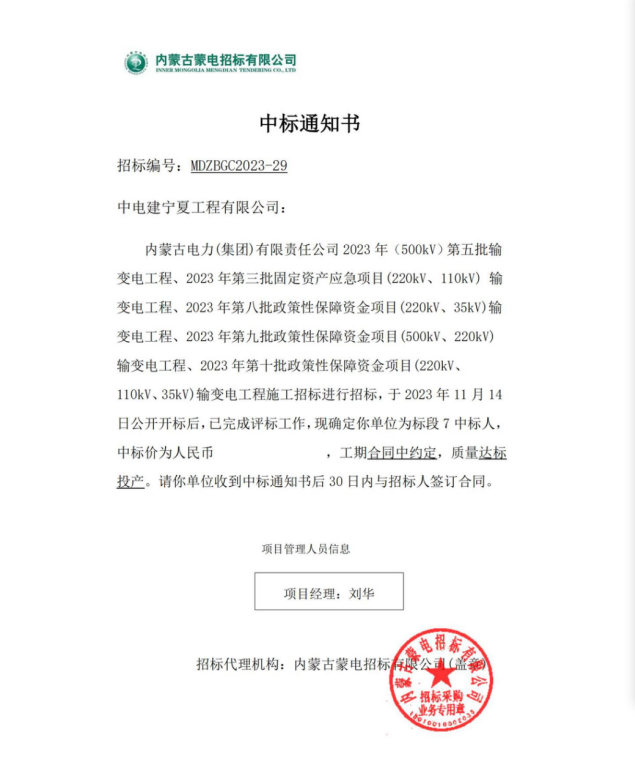 近日,公司中标内蒙古电力(集团)有限责任公司(标段七)鄂尔多斯供电公司乌审旗蒙根其220kV输变电工程变电工程部分(不包含间隔)总承包项目。