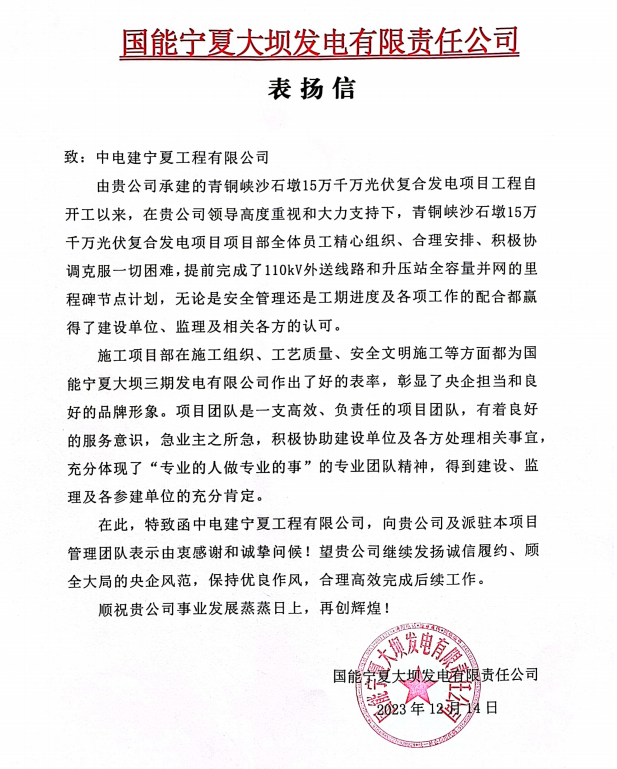 信中,国能宁夏大坝发电有限公司对项目部全体员工精心组织、合理安排、积极协调克服一切困难,提前完成了110kV外送线路、升压站全容量并网的里程碑节点计划以及对项目部“专业的人做专业的事”的团队精神表示高度认可,充分体现了宁夏电建的综合实力。