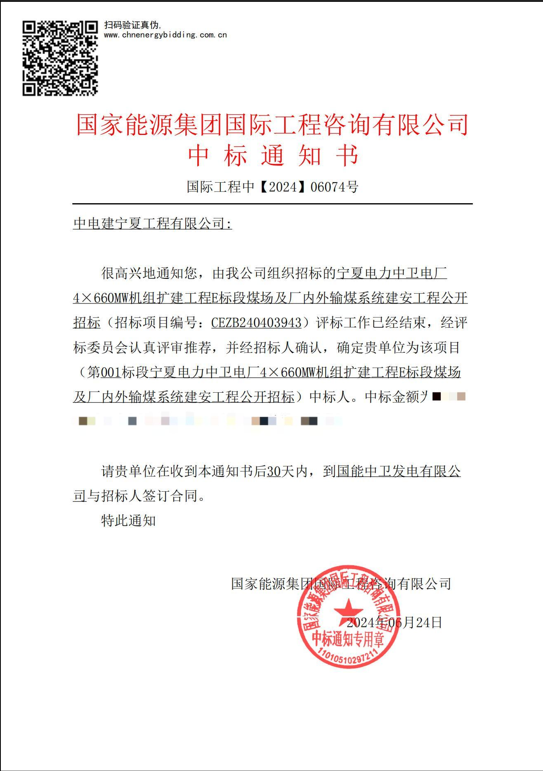 6月25日,公司中标宁夏电力中卫电厂4×660MW机组扩建工程E标段煤场及厂内外输煤系统建安工程,该项目是我公司继中标中卫热电五通一平项目后又一个火电板块战略重点项目,同时该项目为我公司首个以电力工程施工总承包特级资质参与投标的项目,是公司取得特级资质后的“开门红”。