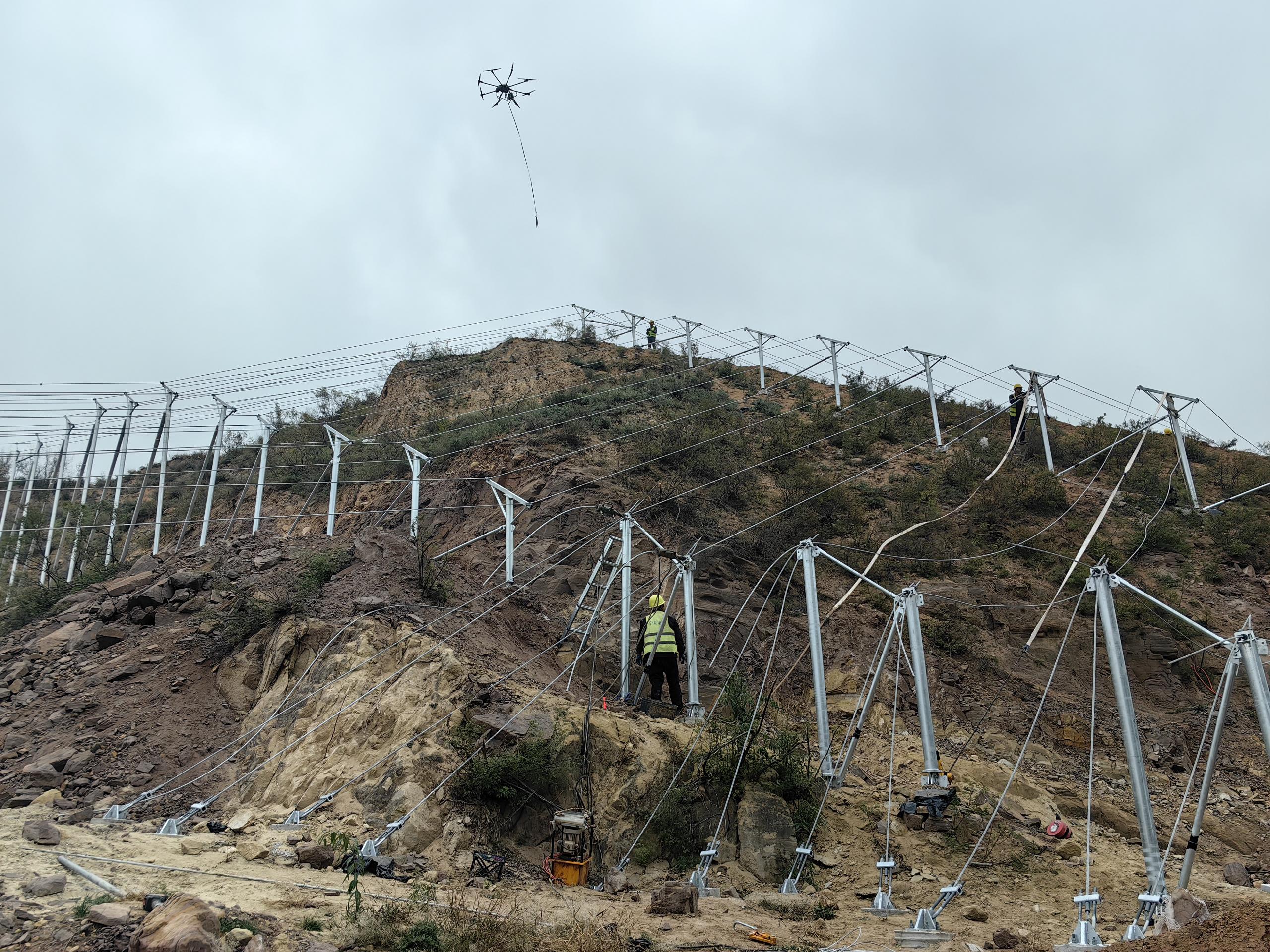 国能霍州农光储旅一体化项目为山地光伏项目,海拔800米,坡度30°—60°,工作面点多且分散,人工运输难度极大,危险系数高。为确保项目高效推进,10月初,公司在霍州项目开展无人机光伏组件运输试点,检验无人机运输的必要性和可实施性。依托自身的高精度定位技术,无人机可以提供精准的定位并且实现稳定的飞行,通过遥控操作,作业人员可让无人机将光伏板吊装到指定位置,极大减少自身工作量,提高运输速度和精度,与传统的作业方式相比,无人机运输的方式也更加安全。通过观测无人机采集的高清影像和发回的实时数据,作业人员可以更加精确地掌握现场情况,确保每一步操作都符合安全规范。