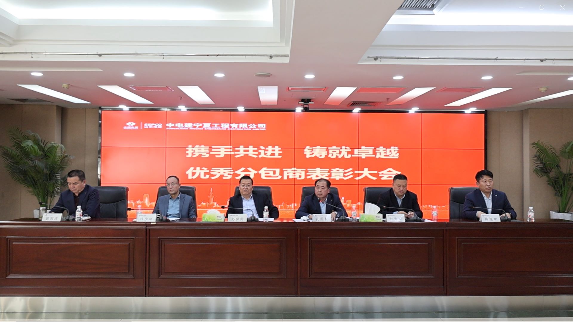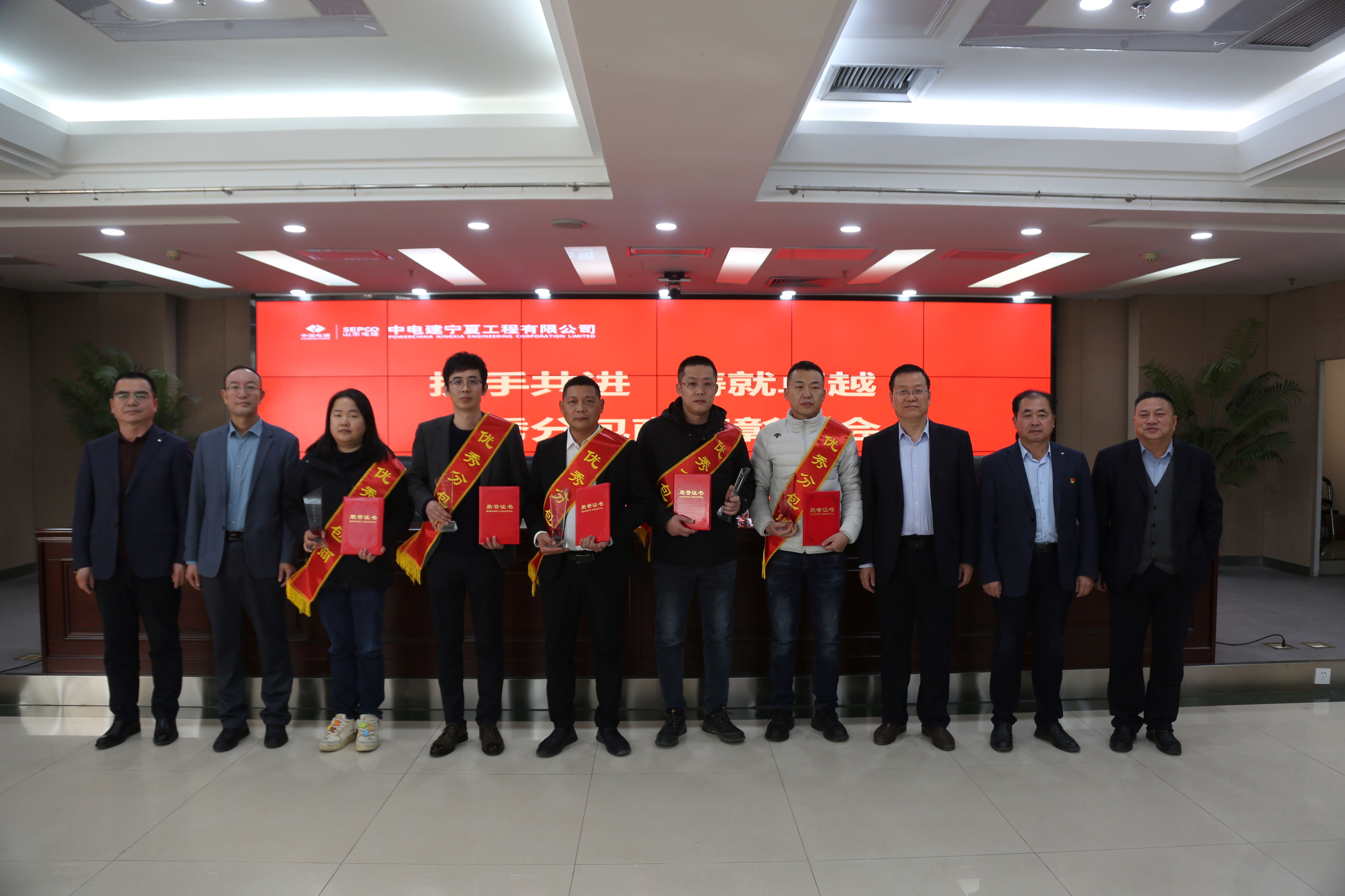 随后,铁少斌宣读优秀分包商表彰决定,山东怡光建筑工程有限公司、四川欣福建设工程有限公司、邹城市昱龙工程有限公司、宁夏众惠建设工程有限公司、吉林省亿瀛建筑有限公司、山东鲁宁建筑安装工程有限公司上台领奖。8家优秀分包商代表依次上台发言,对宁夏电建在工作中给予的支持和帮助表达感谢,并表示未来将持续加强自身管理建设,深化合作交流,携手共进,共同铸就辉煌,向更高的目标攀登。