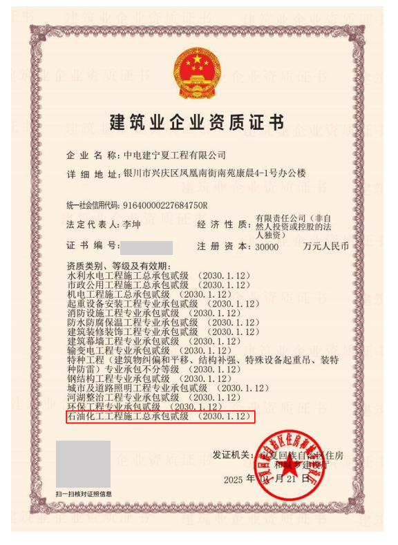 近日,经自治区住建厅核准,公司成功取得石油化工工程施工总承包二级资质。公司现已拥有石油化工、水利水电、市政、机电工程施工总承包以及输变电、环保、钢结构、特种工程专业承包等十五项二级资质,资质的多元化将进一步巩固公司多元化业务发展,增强企业市场竞争力,助力公司高质量发展。