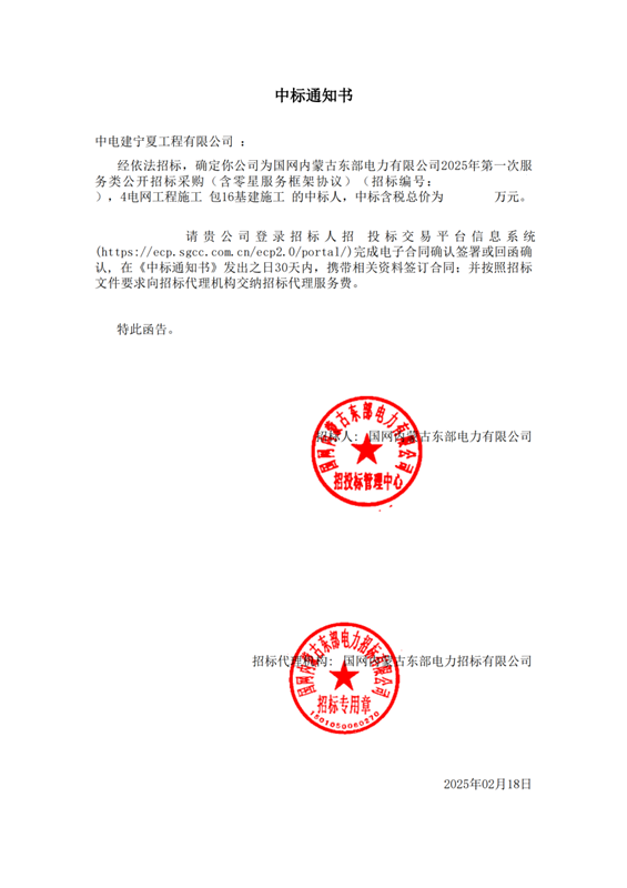 公司中标国网内蒙2025年第一次服务类公开招标采购包16基建施工