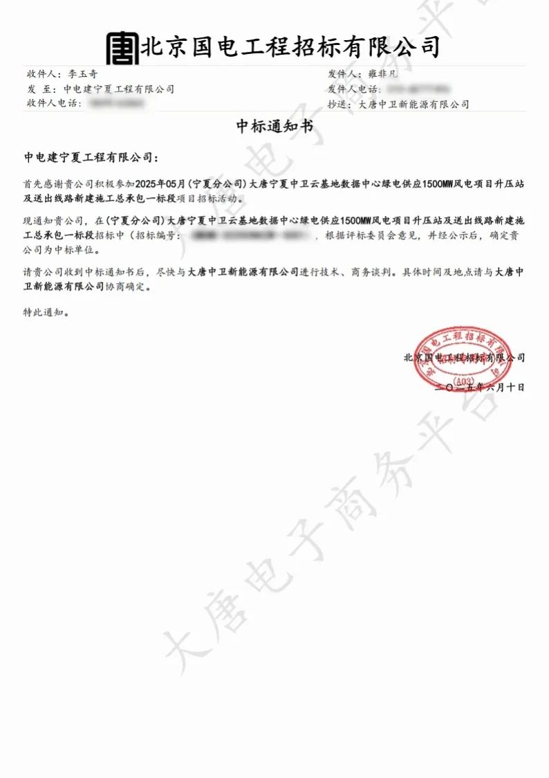 公司中标大唐宁夏中卫云基地数据中心绿电供应风电项目升压站及送出线路新建施工总承包