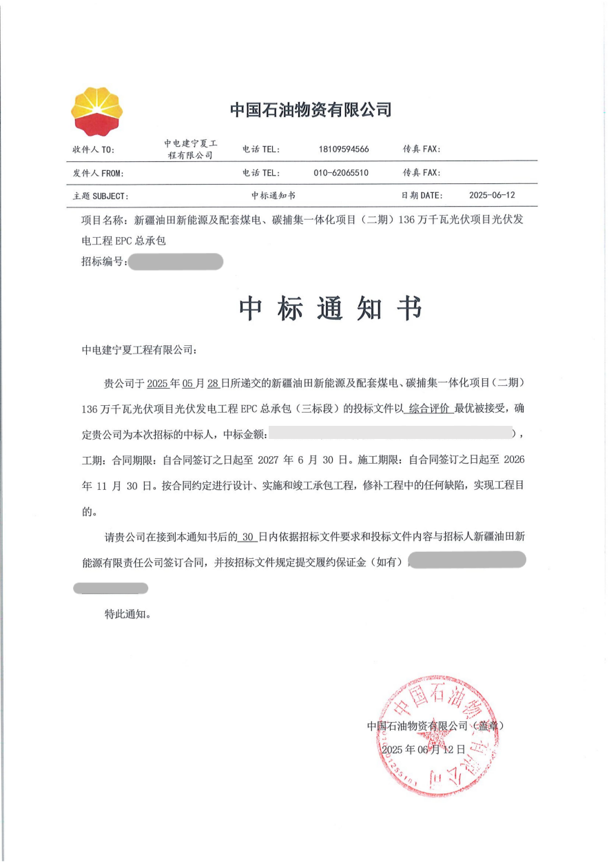 公司中标新疆油田新能源及配套煤电、碳捕集一体化项目136万千瓦光伏项目光伏发电工程EPC总承包项目