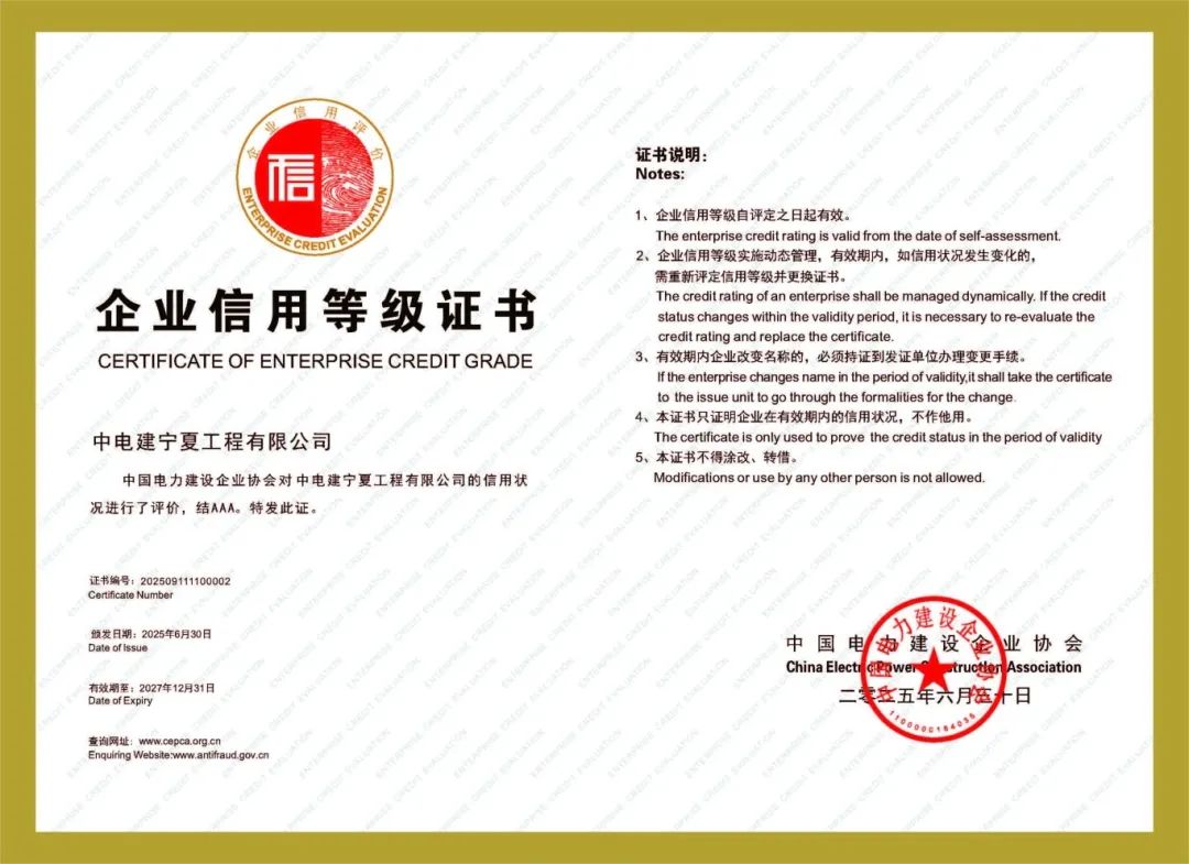 中国电力建设协会的企业信用等级AAA级是行业最高信用等级,评价涵盖合同执行、法律法规遵守、社会责任等多维度,有效期两年,是企业在合同履约、诚信经营等方面的有效认可。