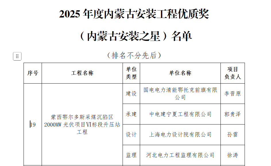 近日,蒙西鄂尔多斯采煤沉陷区2000兆瓦光伏项目Ⅵ标段升压站工程项目凭借卓越的工程质量、先进的技术应用以及出色的施工管理,成功获评2025年度内蒙古安装工程优质奖(内蒙古安装之星)。