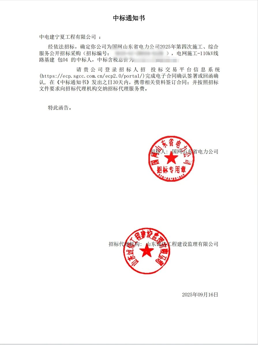 近日,公司成功中标国网山东省电力公司2025年第四次施工、综合服务公开招标采购电网施工-110kV线路基建包04,这是继中标国网蒙东赤峰芝瑞项目后,公司再度在激烈的市场竞争中脱颖而出,成功中标国网施工项目。