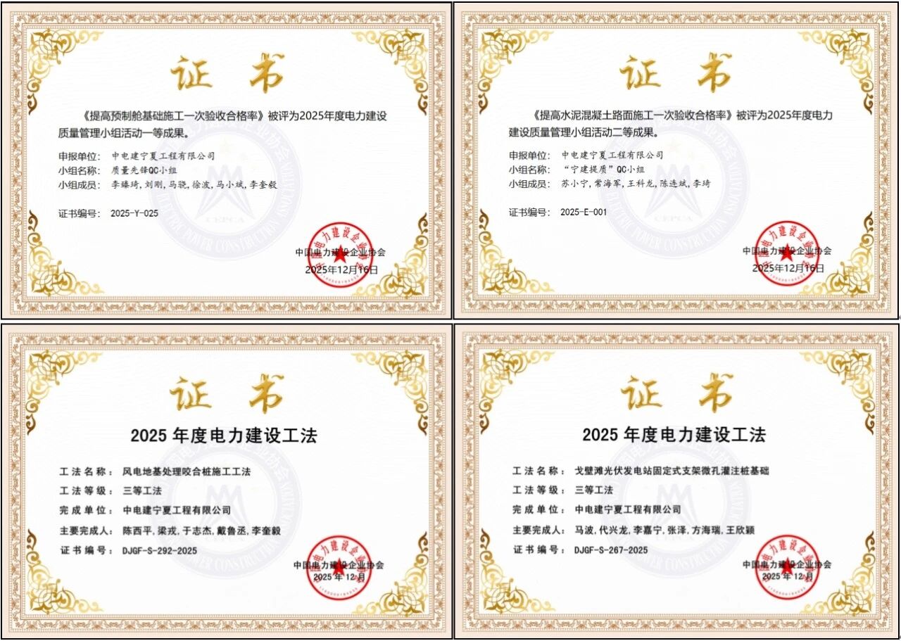 近日,从中国电力建设企业协会传来捷报,公司在2025年度电力建设质量管理与技术创新评选中硕果累累:凭借11项优质QC成果(一等奖1项、二等奖4项、三等奖6项)及2项电力建设工法的突出表现,再度彰显了公司在工程质量管理与技术创新领域的行业领先地位。