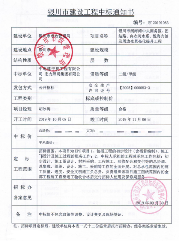 公司中标银川市阅海湾中央商务区、团结路、典农河水系、悦海宾馆及周边亮化提升工程项目EPC工程总承包项目