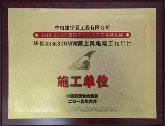 10月15日,在中国投资协会主办的2018-2019年度国家优质投资项目推介表大会上,公司承建的华能如东海上风电项目荣获2018-2019年度国家优质投资项目特别奖。公司副总经理李生录、如东海上风电项目经理王文川受邀参加。