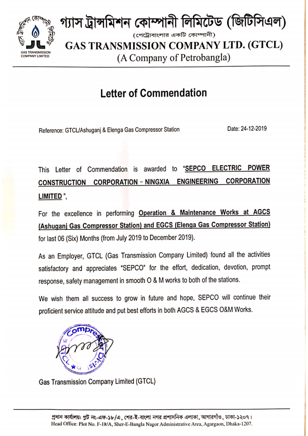 信中,业主方GTCL(孟加拉气体传输公司)对于SEPCO的工作表示十分满意。对项目团队在施工建设中的迅速反应、安全管理等方面给予肯定,并对项目团队在两个利燃气增压站运维工作中所付出的努力表示感谢。