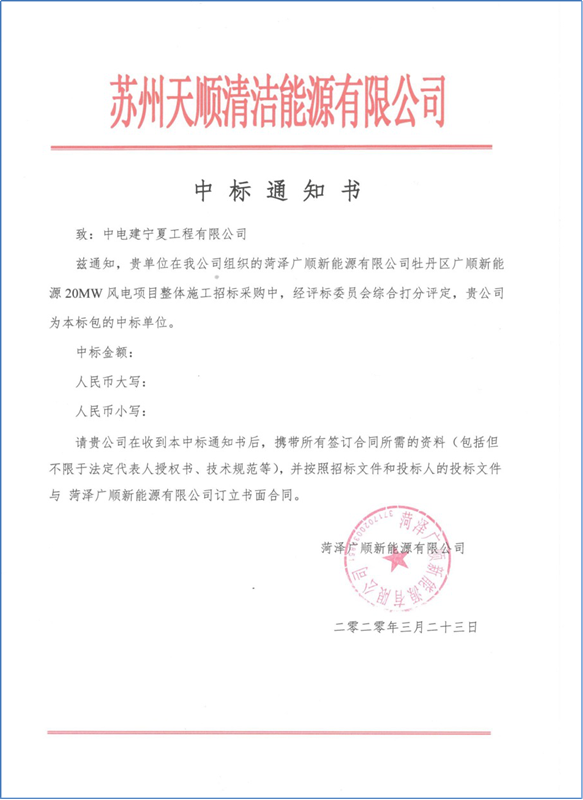 近日,公司中标牡丹区广顺新能源20MW风电项目。