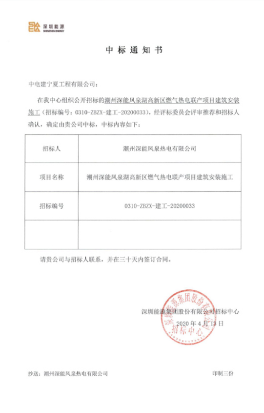 4月13日,公司收到潮州深能凤泉湖高新区燃气热电联产项目建筑安装施工项目中标通知书。