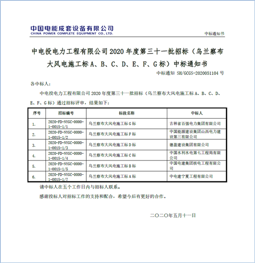 5月11日,公司中标乌兰察布600万千瓦风电基地首批240万千瓦风电项目幸福一风电场600MW风电项目施工A标段。