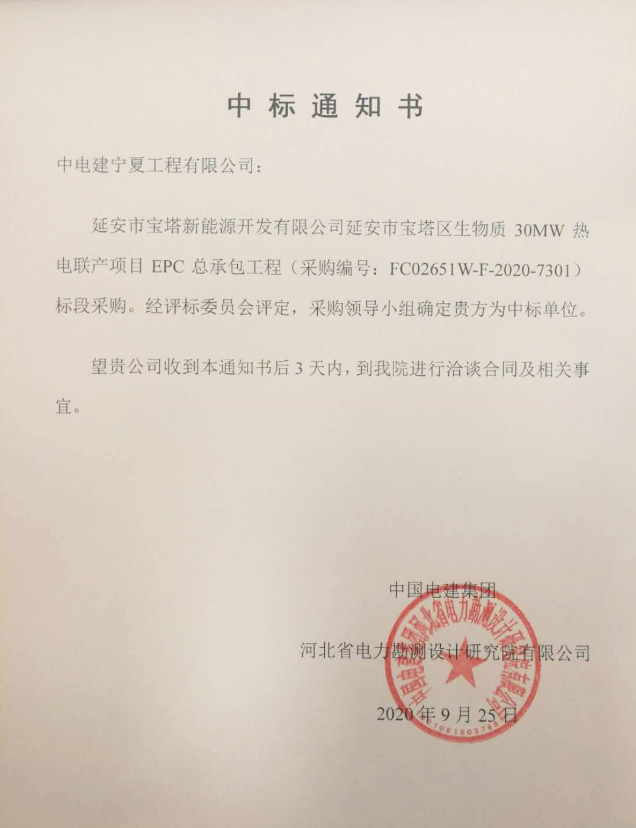 公司中标延安市宝塔新能源开发有限公司延安市宝塔区生物质30MW热电联产项目EPC总承包工程