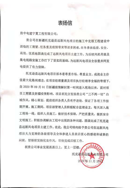 11月10日,新疆托克逊县远新风电项目收到业主感谢信。