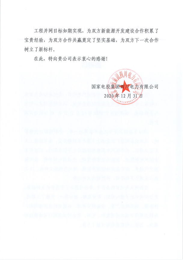 信中对项目团队克服新冠肺炎疫情、风电抢装潮及不利天气条件影响,确保项目于2020年12 月31日成功并网发电表示感谢,并对项目团队在施工建设中精心策划、攻坚克难、团结奋斗给予高度肯定。