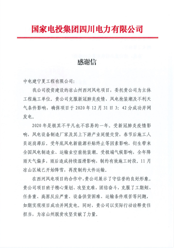 凉山州西河风电项目收到业主感谢信