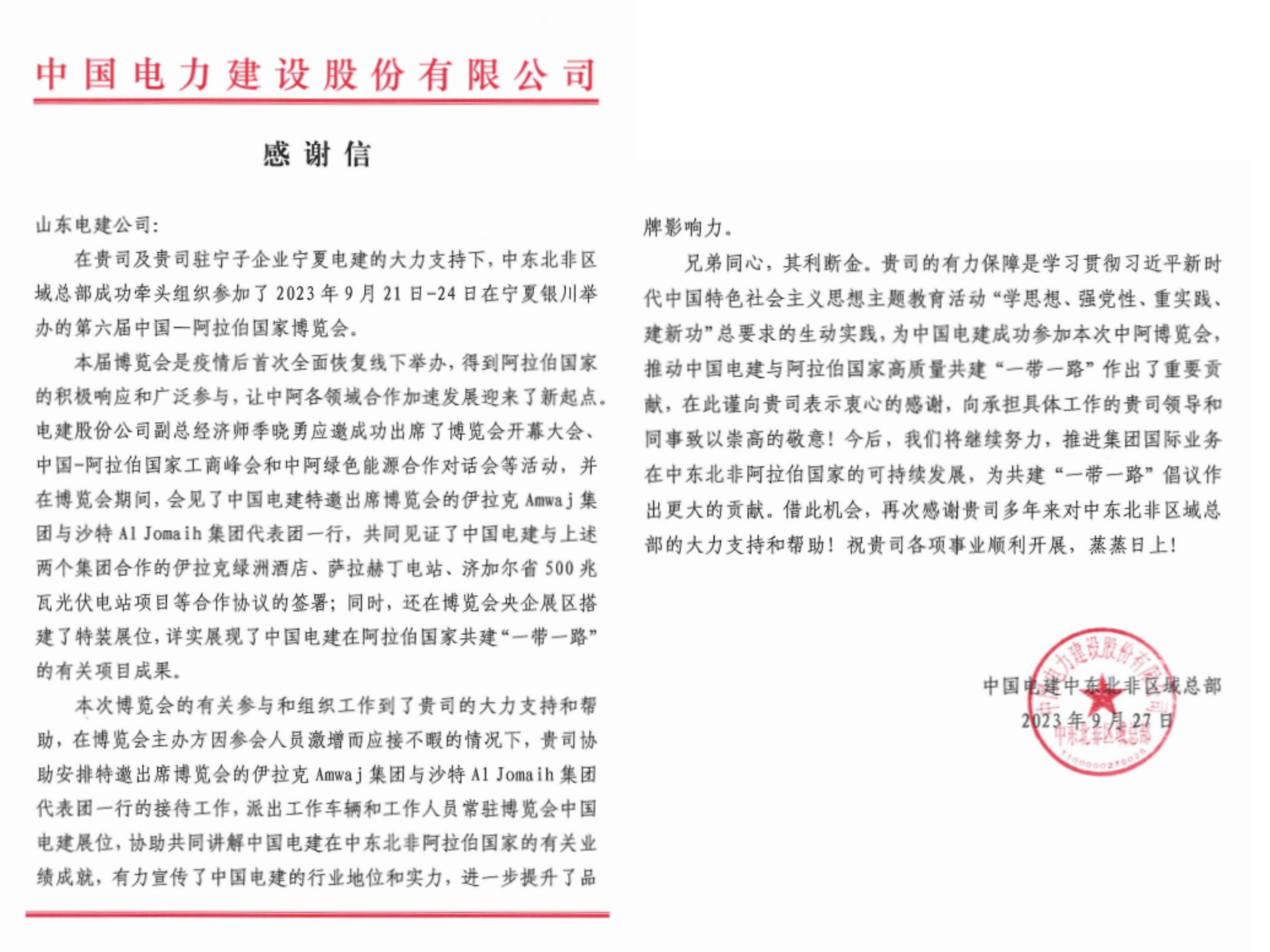 9月27日,公司收到中国电建中东北非区域总部发来的感谢信,对公司在第六届中阿博览会中所做的工作给予认可和感谢。
