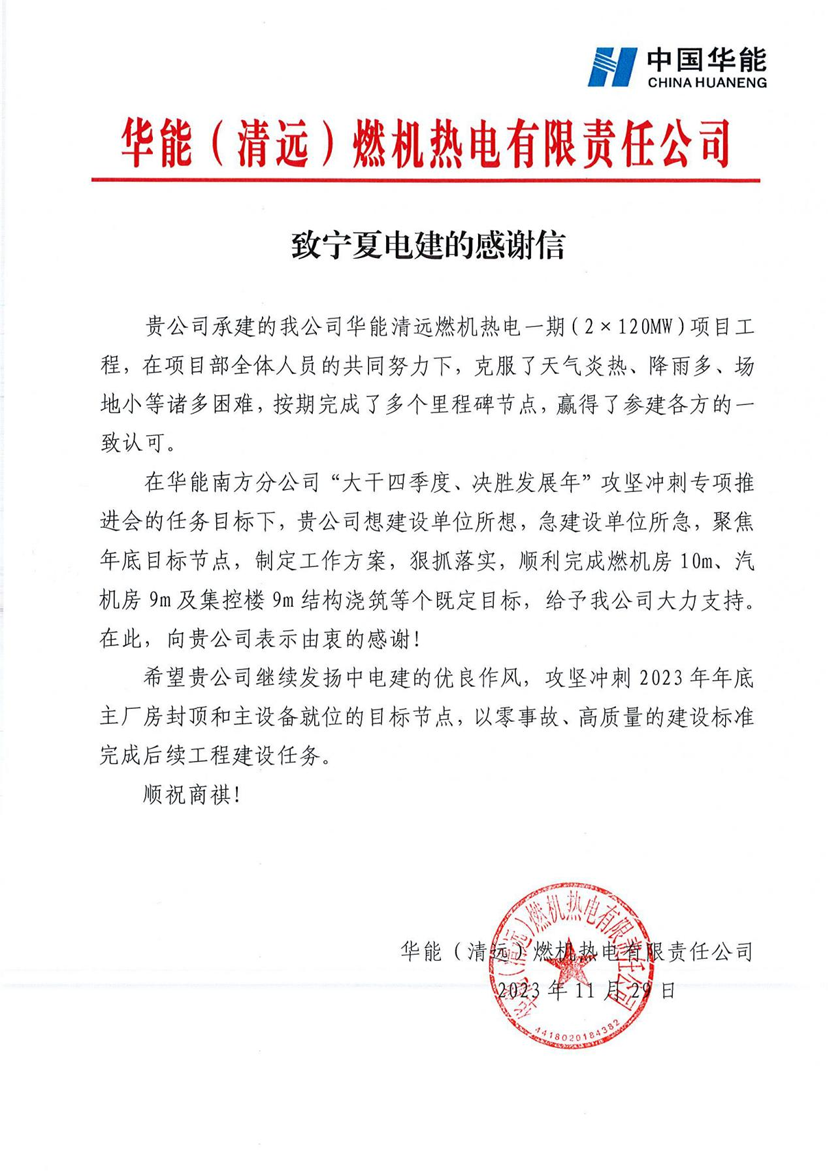 近日,华能清远燃机项目收到业主感谢信。业主对宁夏电建清远项目在工程项目建设期间所展现的专业素质和服务质量的肯定和认可。