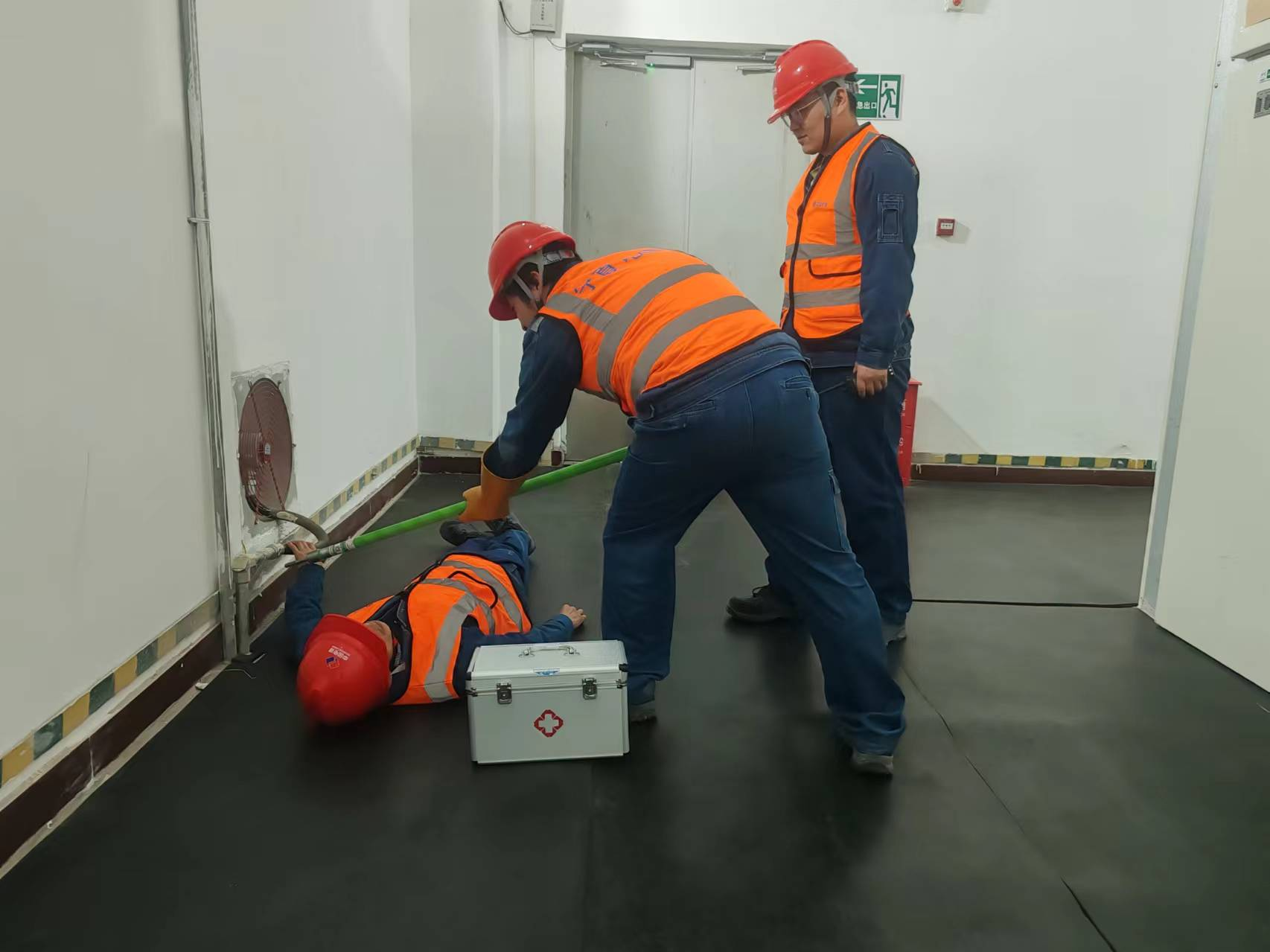 此次演练模拟了运维人员为迎接夏季高温天气,保障各配电室温度正常,运行巡视过程中检查轴流风机误碰裸露带电导线发生了人身触电事故。“触电事件”发生后,现场工作负责人快速反应,立即启动应急响应,断开电源,汇报专业负责人,用绝缘杆将人与电缆分开,伤员转运到安全处,立即对触电者进行心脏复苏按压并拨打120急救电话,顺利完成了触电应急演练。
