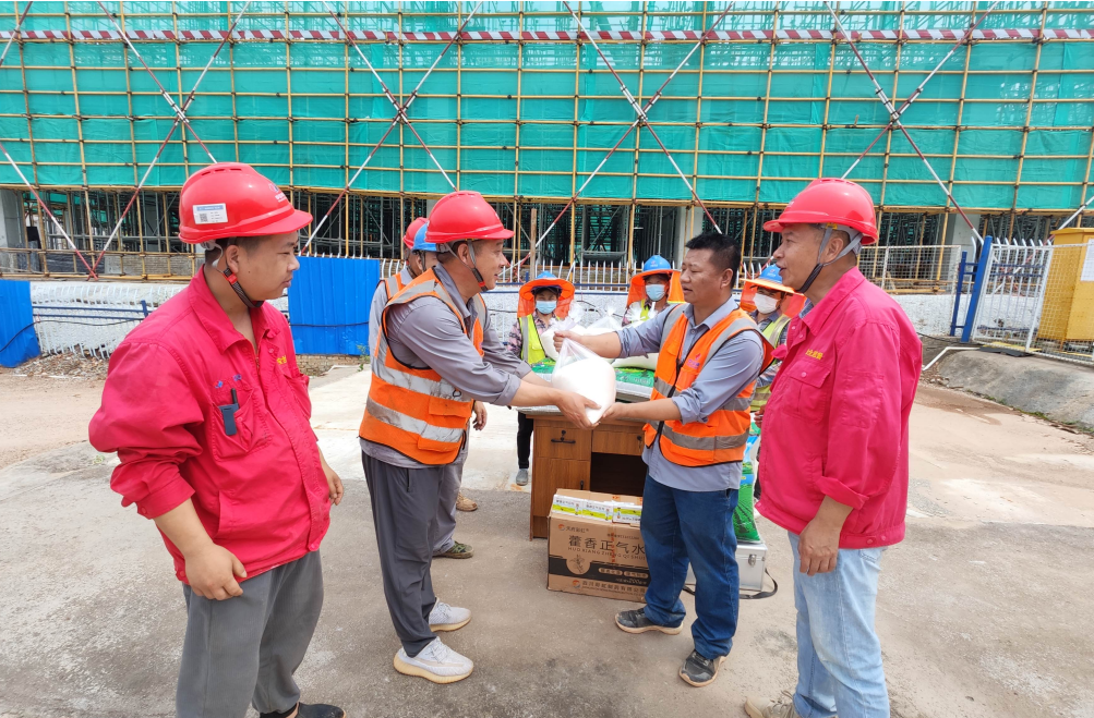 清远项目部高度重视协作队伍防暑降温工作,将其作为一项重要工作做实、做细。项目办公室和安环部积极组织落实防暑降温用品的采购和发放工作,由项目部统一制定标准,并结合各协作队伍实际情况,集中采购了白糖、清凉油、绿豆、板蓝根、藿香正气口服液等防暑降温物品。项目经理李亮和项目安全总监金明将慰问品亲自发放到协作队伍负责人手中,并要求协作队伍负责人切实做好防暑降温相关工作,为一线工人创建良好的工作和生活环境,保证各项工作顺利进行。
