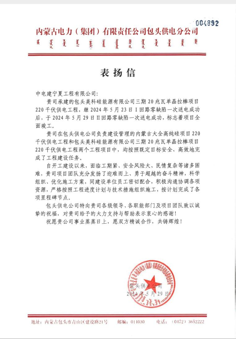 5月29日,内蒙古美科硅20GW单晶拉棒项目220千伏供电工程项目收到业主单位发来的表扬信。