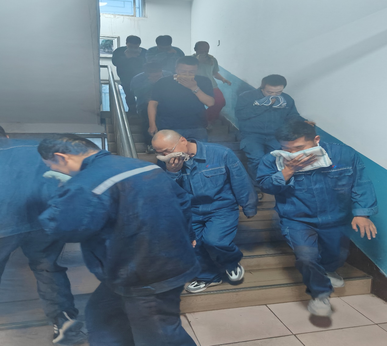 随后,根据项目部的火灾应急预案和处置方案,全体项目成员开展火灾应急疏散演练。各应急小组按照预先安排的职责,迅速响应,严谨执行。参与演练人员用湿手帕、湿毛巾等捂住口鼻,低头、弯腰快速撤出发生火情的楼层,直至最后一名人员逃生至紧急疏散点。整个演练过程组织严密,井然有序。