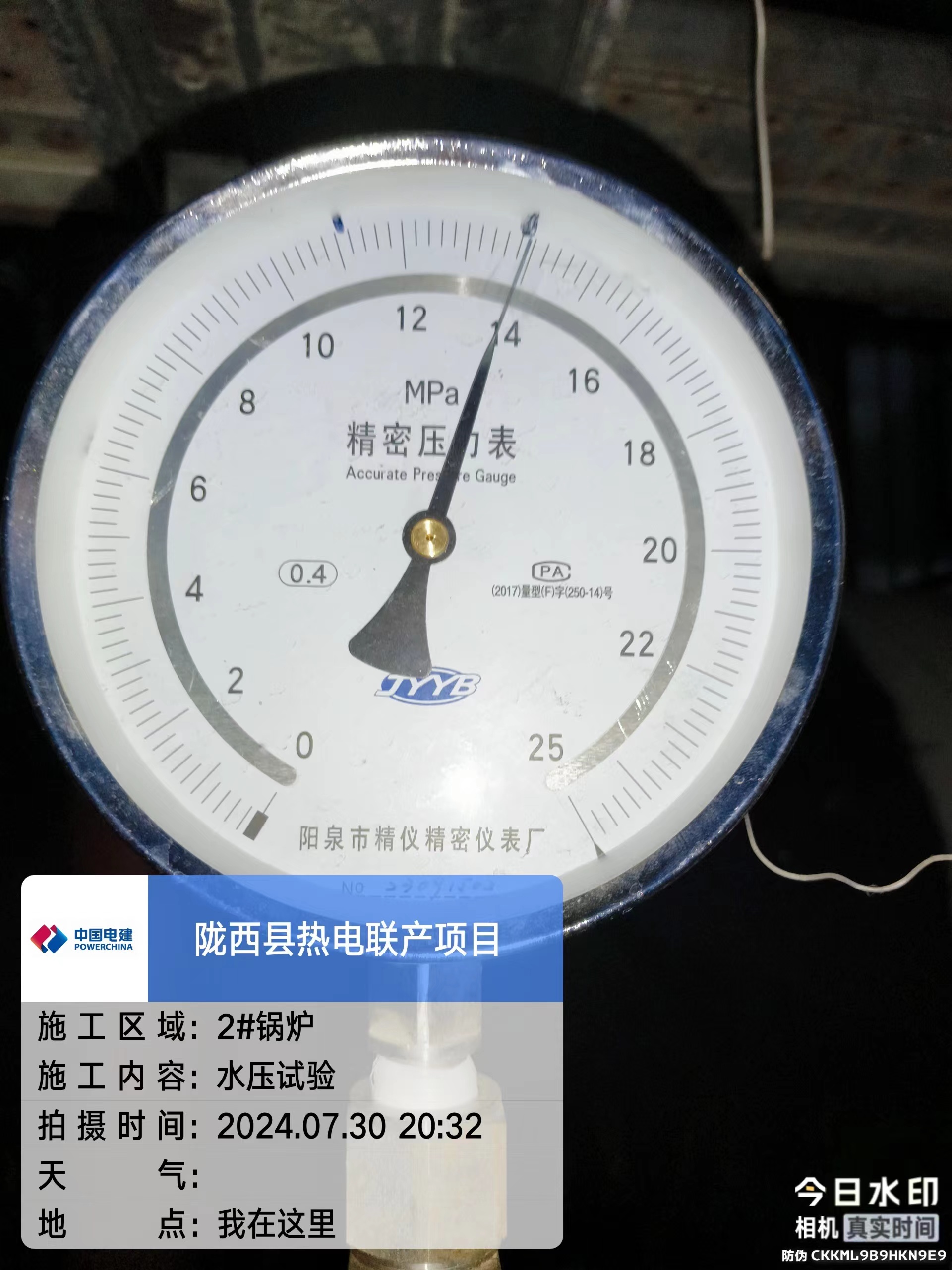 本次水压试验,汽包工作压力为11.18兆帕,超压为13.975兆帕。水压实验严格按照方案要求进行升压、稳压、超压与过程检查、记录,确保水压试验安全完成。试验过程中各系统设备无变形、膨胀无异常、阀门关闭严密、压力无变化,受压元件金属壁和焊缝没有明显残余变形、无泄漏及湿润现象,各项技术指标均达到了设计要求。