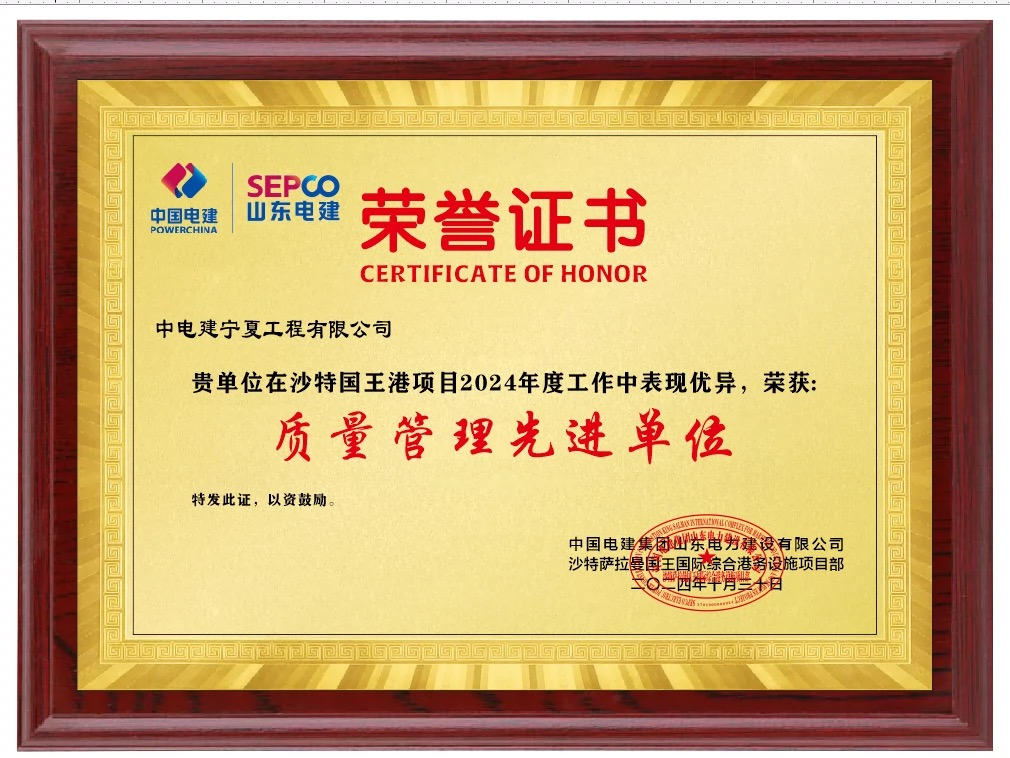 沙特国王港项目部荣获“质量管理先进单位”称号