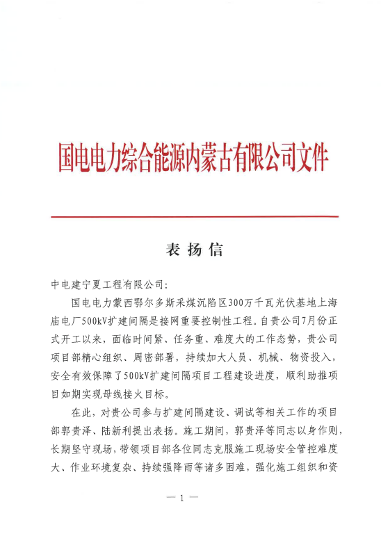 蒙西鄂尔多斯光伏基地项目收到业主表扬信