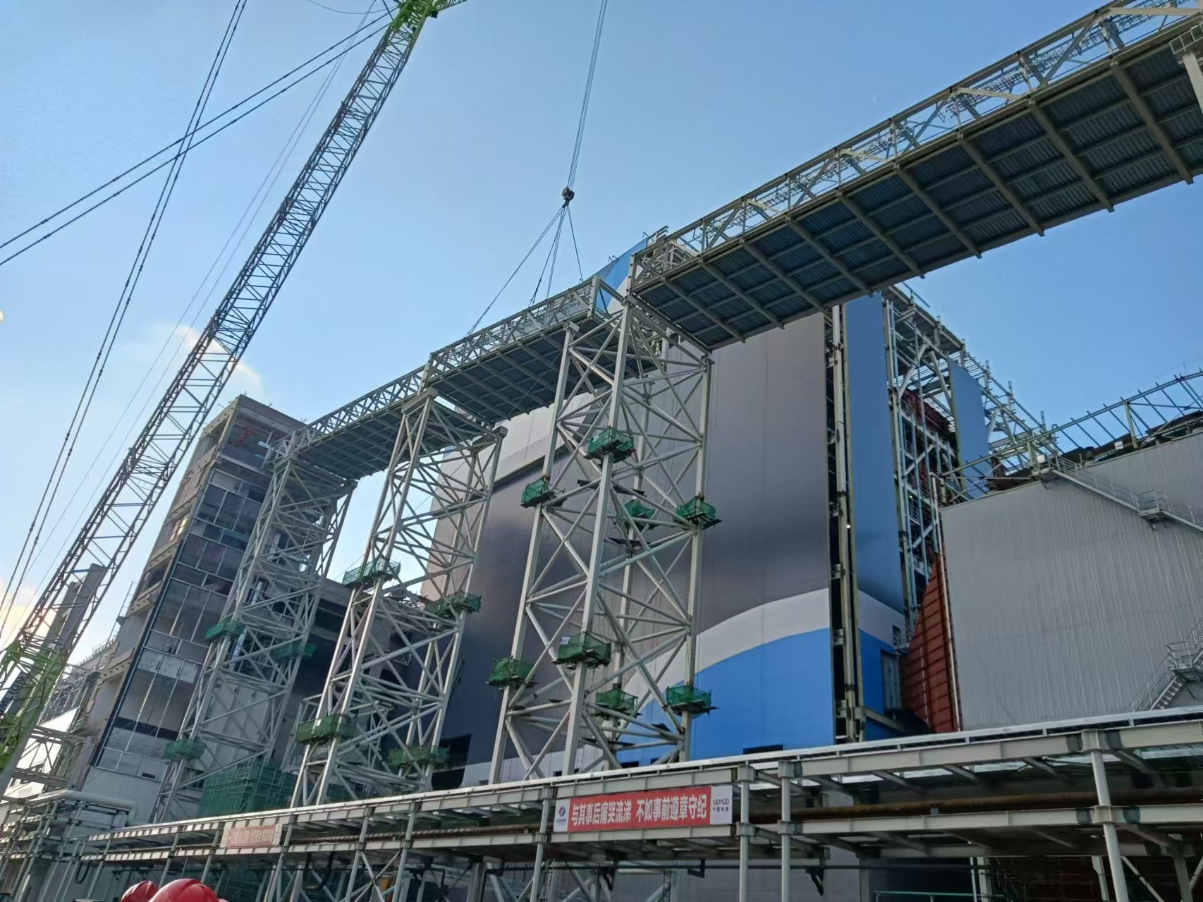 本项目输煤栈桥包含1号输煤栈桥、3号输煤栈桥、4号输煤栈桥及5号输煤栈桥,其中5号输煤栈桥最长、最高,且其位于锅炉东侧,与锅炉、电除尘等施工形成多重交叉作业;为确保节点顺利实现,项目团队知责于心、担责于身、履责于行,上下一心强抓实干,在保证安全、质量的基础上,于10月27日完成输煤栈桥全线贯通工作,此次吊装任务的完成是项目建设过程中又一重要节点,为后续上节点争取了有效时间。