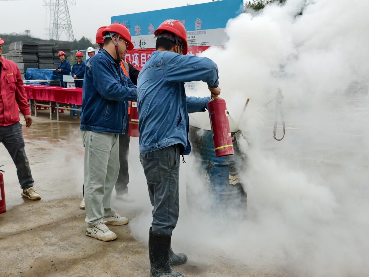 演练现场,项目安环部人员围绕消防基础知识、灭火器材的使用、火灾预防应对等内容,详细讲解火灾预防、初始火灾扑灭、火场逃生技巧等消防安全知识。根据项目实际情况,针对性地分析了施工现场的火灾隐患和风险点,并总结出切实可行的防范对策。同时,为提高消防“四个能力”,培训着重从防火、灭火、逃生、自救四个方面详细介绍了火灾的形成过程、火灾应急疏散常识、自救逃生的方法,并模拟火灾现场,现场指导正确操作消防器材扑灭着火点。